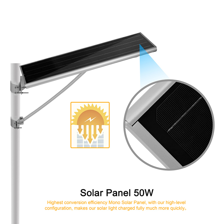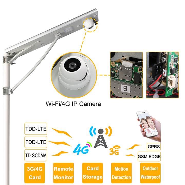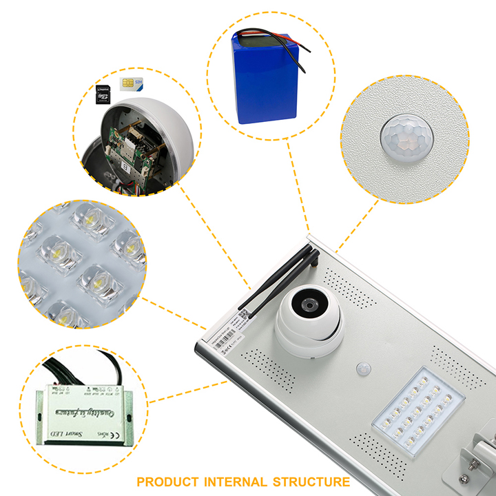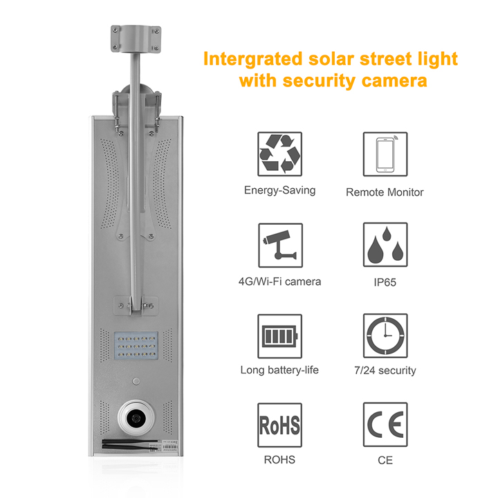1. Environment protective all-in-one solar street lamp with Solar Panel 50W/16V, 25Ah lithium battery, and 4G sim card camera .