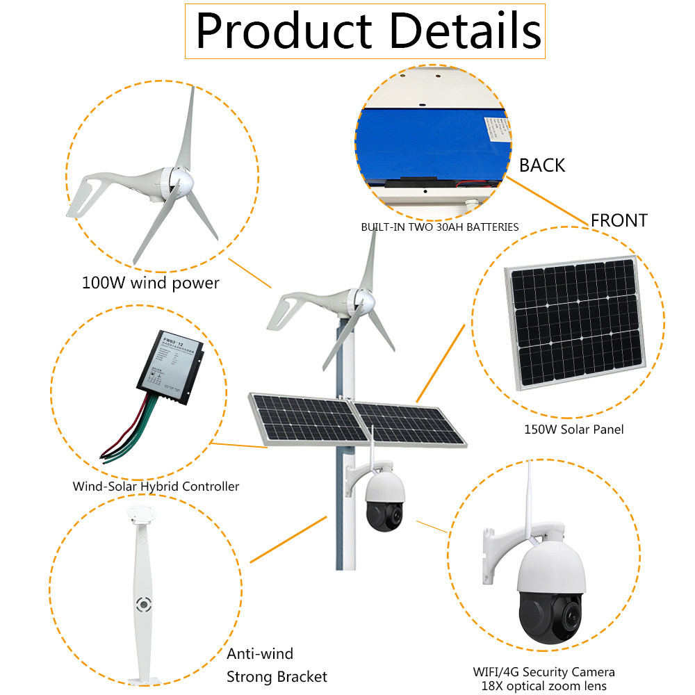 This Wind Solar Hybrid Power System can make the camera continuously working in rainy days, by effective use of sunshine and wind.